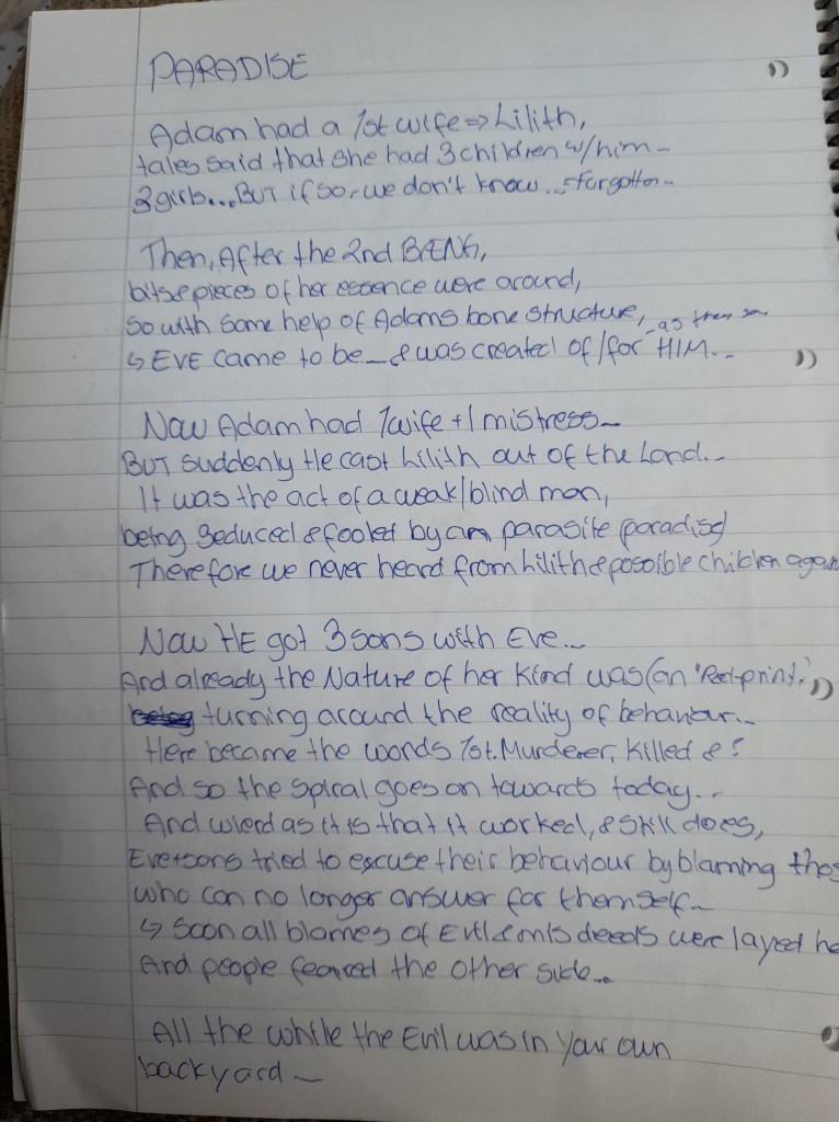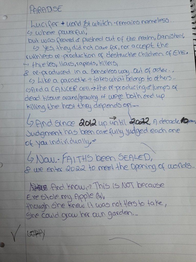 I myself threatened her that she would never get into Paradise, & I know that was unnecessary to say, although it is true… She is barely no more,& her inner core just died… So she has no legal bllodline… The reason as to WHY I shouted was not cause she stole my 1st APPLE, even though she knew it wasn’t hers to take. She could grow her own garden. I was mad cause itb seemed like she had more of an interest to rip up virginity land & throw away & destroy what weve had proudly made…… Disrespecting……
