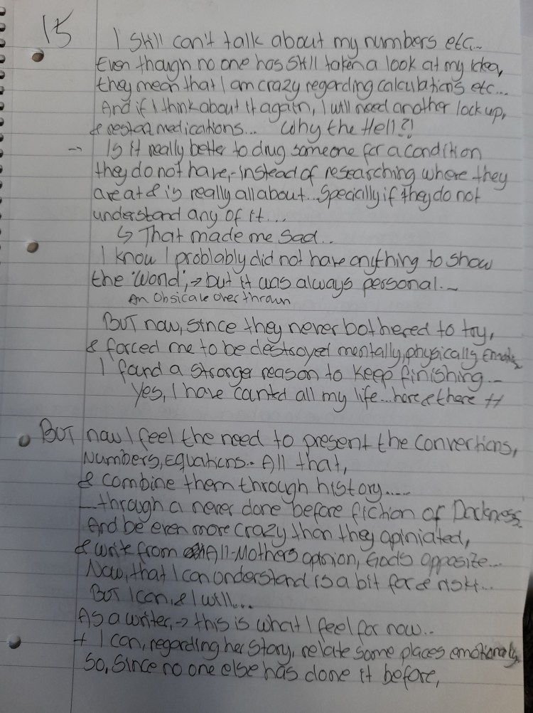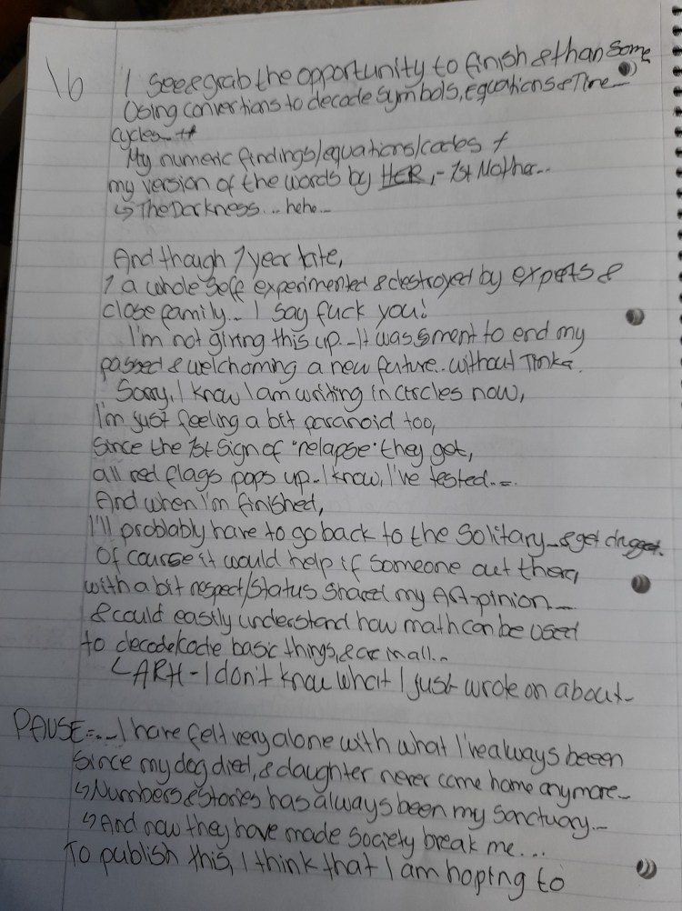 Also , I have found some solutions, or at lesat NEW POINTS OF VIEW in most of it… Ive found equations,convertings & Connections I cannot find at all on the internet…. And I have been searching for a loooong time…. Therefore, I need to know if I am crazy,- as my family & health system means, or if I am on to something, anything–> regarding this… Now,- these people around me who shake their head & say I am lost, have never taken a look at any of my ideas or work, just some illustrations,- and cause they dont kknow math,- they turn their head within seconds… Totally rejected… They could at least asked where I am coming at BEFORE they forced me on medications that fuckes up your head & body…. Yes, Im madly disapintment… Because of those pills, I havent had my daughter at home for a long time. And THAT is tirning me crazy…